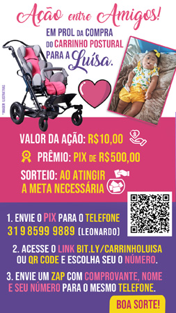 Em função dos elevados gastos inerente a condição de Luisa, eles contam com a sensibilidade e contribuição da sociedade e amigos para ajudar a oferecer melhor qualidade de vida Luisa. “Estamos com a rifa e também com a campanha de doação de qualquer valor”, lembra o Pai, Leo Feragom.
