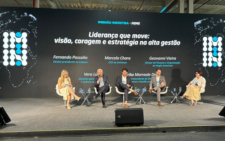 O CEO da Usiminas, Marcelo Chara, participou, na noite de 16 de outubro, do painel “Liderança que Move: Visão, Coragem e Estratégia na Alta Gestão”, realizado durante o evento Imersão Indústria FIEMG, em Belo Horizonte. O debate reuniu nomes de destaque da indústria, como Vera Lúcia, gerente-geral de Desenvolvimento Humano e Organizacional da Samarco; Geovanne Vieira, diretor de Pessoas e Organizações da Anglo American; e Fernando Passalio, diretor-presidente da Copasa. A moderação ficou a cargo de Érika Morreale Diniz, superintendente de Defesa de Interesse e Gestão da FIEMG.