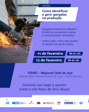 A FIEMG Regional Vale do Aço, em parceria com o Sebrae Minas, promove nos dias 11 e 12 de fevereiro o curso “Como Identificar e Gerir Gargalos na Produção”, uma capacitação prática voltada para profissionais que desejam melhorar o fluxo produtivo, reduzir perdas e aumentar resultados. Os encontros serão realizados das 8h às 17h/8h às 12h, na sede da FIEMG Regional Vale do Aço – Av. Pedro Linhares Gomes, 5431 – Horto, Ipatinga.